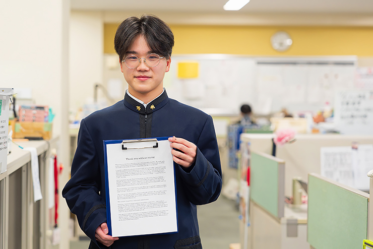 まず、最優秀賞と聞いたときは、本当に驚きました。まさか自分が選ばれるとは思っていなかったので、“本当かな?”という気持ちでいっぱいでした。エッセイでは、ただ感情を並べるのではなく、その感情がどれくらいのものなのか、どんな揺れ方をしたのかを英語で表すことにすごく悩みました。まず日本語で細かく感情を分けてから、それを英語に置き換えていく作業をしました。ほかにも、国語の授業で学んだ“余韻の残し方”や、秀光中学校から秀光コースの内部進学選考を受けるときに取り組んだ作文の経験も、とても役に立ちました。文章の細かい表現力は、そのとき身についたものだと思います。今回の受賞は、英語力というより、自分が伝えたいと思った気持ちが読んだ方に届いたことが一番嬉しいと感じました。これを励みに、高校2年生から始まる国際バカロレアのDPに向けて、さらに努力をしていきたいと思っています。