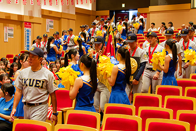 ▲7月29日、「第107回全国高等学校野球選手権大会 宮城大会優勝報告会並びに壮行会」が宮城野校舎で行われました。硬式野球部、チアリーディング部、吹奏楽部、生徒会執行部と、保護者の方が集まりました。