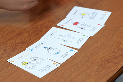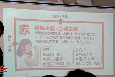 授業は浅利氏による講義から始まりました。まず6〜7名のグループに分かれ、52枚の行動特性が書かれたカードから「今の自分」を表す13枚を選び、さらにその中から特に大切な2枚を選出しました。カードを用いてグループで1分30秒の自己紹介を行ったり、クラスメイトのカードを見比べたりすることで、相互理解を深めていきます。カードは4色に分類されており、赤(結果重視)、黄(直感・発想)、青(分析・慎重)、緑(協調・安心)といった、カードタイプごとに異なる考え方や行動の特徴が紹介され、相手に合わせた伝え方・聞き方を体験しました。