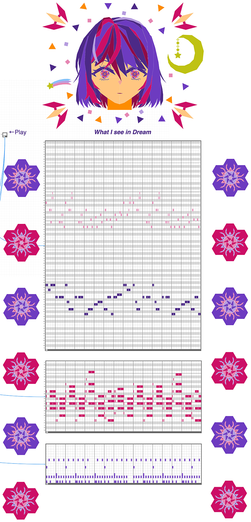 最初は操作に苦戦しましたが、自由な図形を使う機能がある中で、あえて既存の図形だけを組み合わせて描くことに挑戦しました。角度を一つひとつ計算しながら進めるのは大変でしたが、その分、自分の数学力が鍛えられたと感じています。髪の部分は自由な図形を用いましたが、目や楽譜の横にある花などは既存の図形で表現しているので、ぜひ注目してもらいたいです。