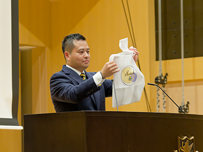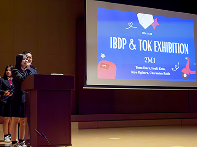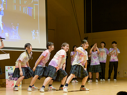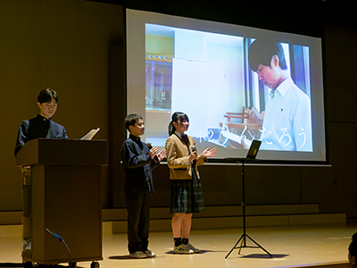 まず、ゼルコバホールで第1部は、各学年の探究を中心に、IB(国際バカロレア)DPでの学習内容などの学習成果をスライドや自主制作の動画で堂々と発表しました。続いて、今年の新企画として注目を集めたのは、ESS部による英語での袴歌舞伎「KURUMABIKI」。袴を着て英語で歌舞伎を演じるという、世界でも初めての試みです。事前に歌舞伎俳優・中村壱太郎さんをはじめとしたプロの方から直接ご指導をいただきながら練習を続けてきました。