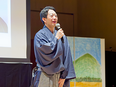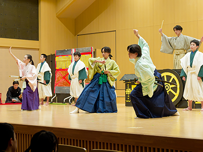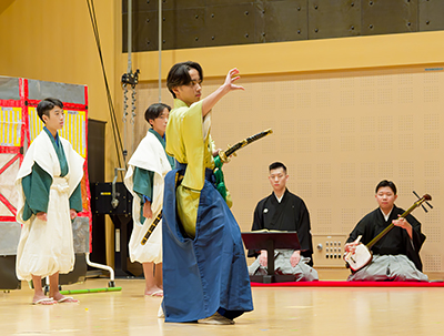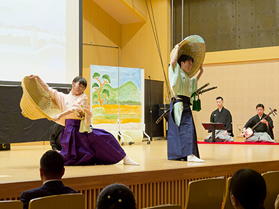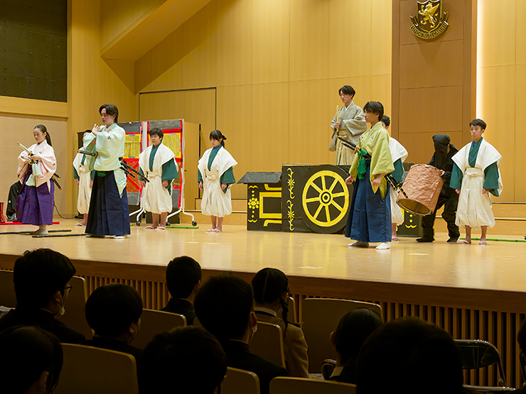 ESS部による袴歌舞伎の演目は『菅原伝授手習鑑』より「車引」。当日、ご指導をいただいた歌舞伎俳優・中村壱太郎さんがステージに登壇され、英語での袴歌舞伎実現までの経緯について語ってくださいました。プロの三味線や太鼓の奏者による生演奏も加わり、袴姿の生徒たちが堂々と見栄を切る姿は観客を魅了しました。