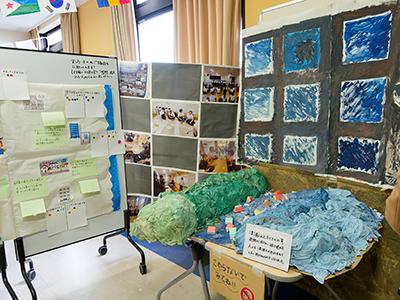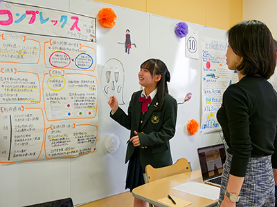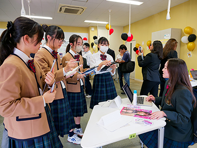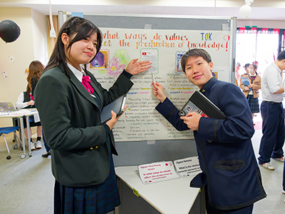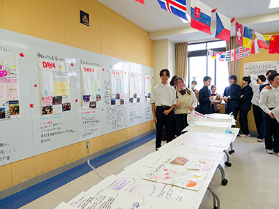 続いて第2部は、アクティブラーニングルームや各教室で展示・学習成果発表を実施。高校生は1年生がPP(Personal Project)、2年生がTOK(Theory Of Knowledge)での探究を中心にIBの学びについて発表しました。中学生は起業体験ワークショップ、職場体験とSAAP展示発表、カナダでのGLA研修など、幅広い分野の展示発表を行いました。探究と表現が融合した展示の数々は、訪れた方々に秀光生の多彩な学びの深さを伝えることができました。