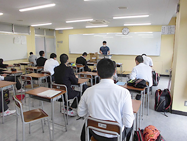 ライオンズホールをスタートして、北辰館、グローリーホールなどを含めて、すべての校舎を回り、生徒の授業の様子を撮影しました。外国語、英進進学、フレックス、技能開発の4コースそれぞれ、授業でのさまざまな工夫がなされていました。