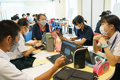 授業は7月4日からスタートし、全5回で実施。初回の授業はアイスブレークから始まりました。生徒5〜6名で班に分かれて、各班を指導していただける社会実業家のINTILAQのメンターの方と、お互いに呼んでほしいニックネームや部活動、趣味などを発表します。初回はクイズに挑んだりするなかで、生徒たちはすっかり打ち解けていました。その後は、社会実業家の方による講演を聞き、班ごとに話し合いが続きました。そして中盤からは「食」、「地域・まちづくり」、「環境」、「福祉・医療」、「教育」の各テーマごとに分かれて、フィールドワーク実施場所を検討しました。実際に班ごとで企業を訪問し、さまざまな視点から気づいた問題点を解決するために考えた企画を練っていきます。