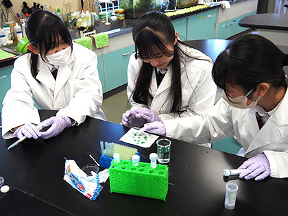 仙台育英特別進学コース・秀光コースの生徒の希望者が実験を行う理科の特別講座「サイエンス・コ・ラボ」。今年度は全7回、毎回異なるテーマで大学の先生方から専門的な指導を受けることができます。第5回目のテーマは「三次元培養法」。教授である珠玖仁先生とTAの皆さんから、アルギン酸ゲルを使った“ハンギングドロップ法”という三次元での培養法を中心に、顕微鏡を使った細胞の観察などを行いました。生徒たちがアルギン酸溶液の中でも粘度の高いものを別な容器に取り分けるとき、その工程に苦戦する場面も。そんなときは珠玖先生やTAの皆さんがマイクロピペットの取り扱いについて的確なアドバイスをしてくださり、後半には全員がうまく扱えるようになっていました。