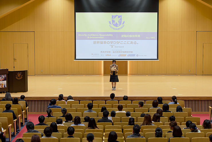 ゼルコバホールでの全体会では、加藤聖一校長先生が国際バカロレア【IB】MYP・DPなど、教育の特色を紹介されました。入試広報部の担当者からは1回分の受験料のみで秀光の入試を最大3回受験できることをはじめ、入試要項について丁寧にご案内しました。