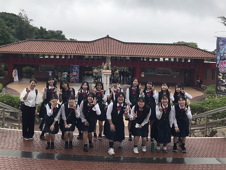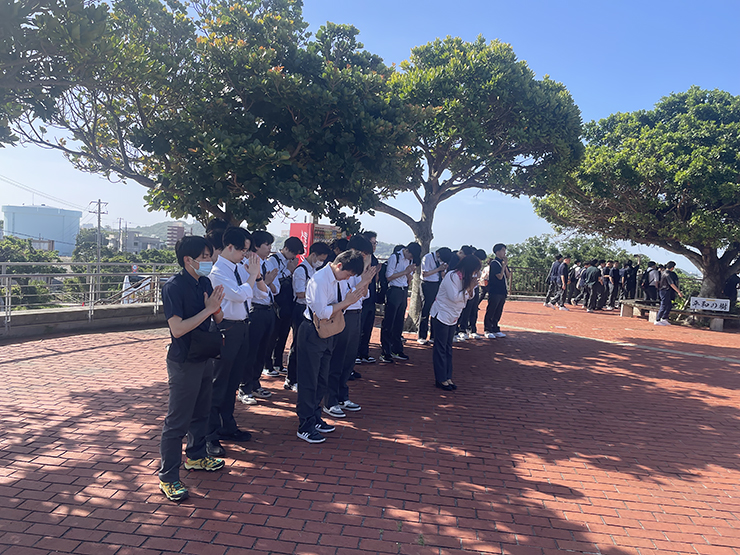 研修旅行2日目、この日は旧海軍司令部壕・ひめゆりの塔・平和祈念資料館の見学をおこなった。戦争の悲惨さを直に感じる体験は初めての生徒が多く、真剣な表情で見学し、講話も聴いていた。午後には那覇市内の班別自主研修をおこない、見知らぬ土地に戸惑いながらも集合時間まで楽しむ様子がみられた。