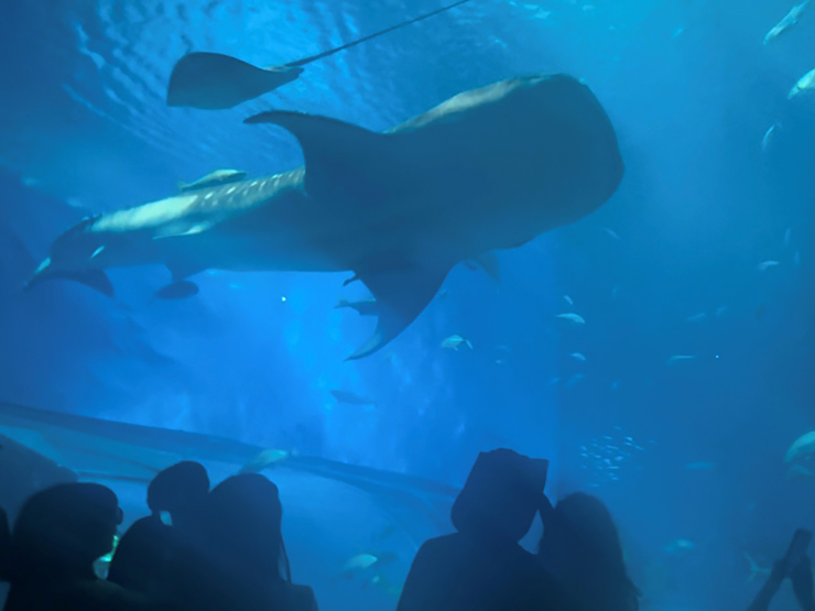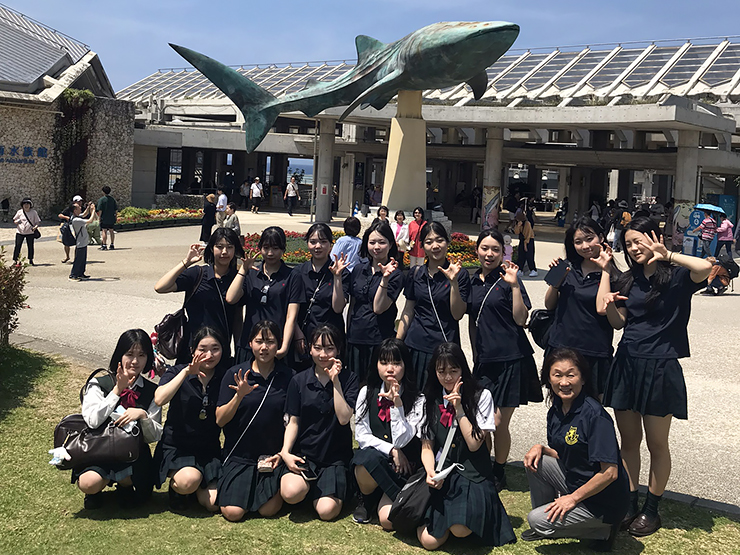 12時30分:沖縄海洋博記念公園にて、美ら海水族館を見学し、沖縄の海の生態系を学ぶことができました。大きな水槽で悠々と泳ぐジンベエザメやマンタは圧倒される迫力があり、生徒たちはカメラを片手に感激していました。また、記念公園内には沖縄郷土村などもあり、歴史や文化の理解を深めることもできたと思います。