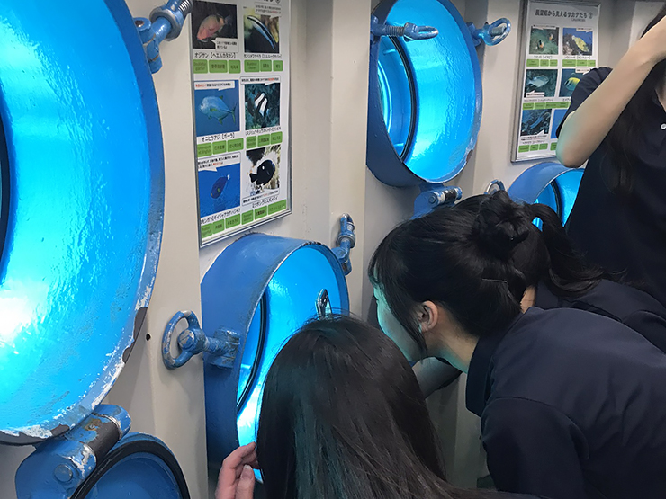 8時30分に貸し切りバスにてホテルを出発し、ブセナ海中公園に到着しました。天気も快晴であり、エメラルドグリーンの海に生徒たちからは感嘆の声があがっておりました。そこからクラス毎に記念撮影を行い、グラスボートに乗りました。係の方が魚たちの説明をしてくださり、生徒たちは沖縄の綺麗な海の中を泳ぐ魚を見ながら熱心に聞き入っていました。その後、海中展望塔へ赴きました。展望台へ向かう途中の大橋上からも魚たちの様子が見ることができ、沖縄の海の透明度に驚きました。海中展望台の中では、魚の群れやサンゴなどを見ることができました。
