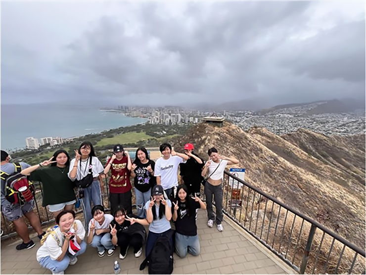 バスでダイヤモンドヘッドへ向かいました。往復で約1時間半のハイキングでした。実際に山を見て今からこれに登るのかと生徒たちは当初驚きつつ不安がっており、ハイキングは大変そうでした。しかしながら頂上から見た美しい壮大な景色に感動し、眺めが素晴らしかったととても喜んでいました。初登山だという生徒も多く、山登りの達成感を感じ取り、とても素晴らしい思い出になりました。