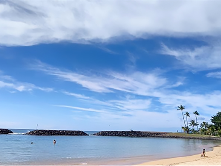 授業初日、1時間ほど学校近くのアラモアナビーチで海水浴を楽しみました。2班が行った日は、比較的穏やかな海だと思われますが、Angel先生が「こんなに波が荒いなんて」とおっしゃっていました。生徒達の安全に問題はなく抜けるように澄んだ青空のもと皆楽しんで水浴びをしていました。-