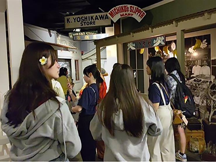 日系4世のガイドさんに移民の暮らしぶりや苦労等を伺いました。その後日本からハワイに移住した人々の生活について、また第二次世界大戦中のハワイ在住日系人の待遇についてのショートムービーを見ました。日本とアメリカが戦争を始め、日本の物がすべて失われた。ハワイでの日本人強制収容、1945年の抑留者の帰還、「頑張れ」「おかげさまで」「もったいない」の歴史土台など、生徒達は真剣に見入っていました。ショートムービー閲覧後はとても興味深そうに展示物を見ていました。生徒たちは様々な視点から歴史について学び、理解を深めて自分の中に吸収していきました。
