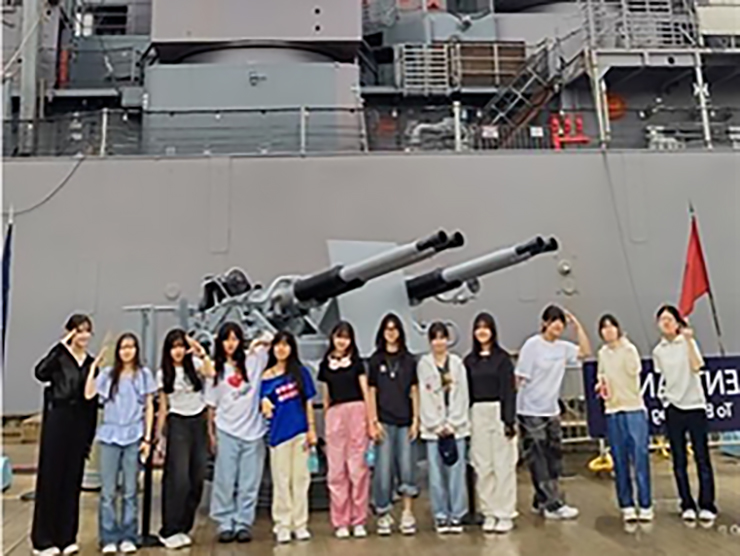 Pearl Harborにある記念館、戦艦「ミズーリ」を訪れました。先日事前の説明を受けていたものの実際に訪れて、現地のガイドさんから初めて聞く話も多く、その表情は真剣さがにじみ出て、集中して聞いていました。主砲16インチ砲、降伏文書調印式会場、神風特攻機衝突跡を見学し、主砲の威力やミズーリの歴史について伺いました。初めはその大きさや船の設備に驚いていましたが、説明を聞くにつれこの場所の大切さや意味を理解していきました。その後戦艦の中を見学しました。水平の食堂や厨房、寝泊まりする部屋、歯科や郵便局等の施設等があり、当時の生活に思いをはせました。生徒達は難しい内容でもしっかり聞き、目に焼き付けていました。とても勉強になったようでした。-