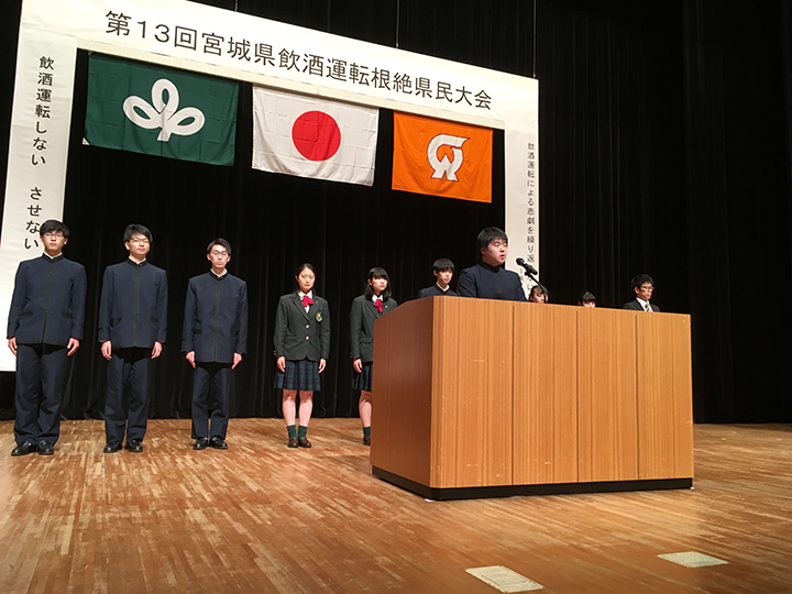 『宮城県飲酒運転根絶県民大会』は今年は大河原町で開催されました。会場となった仙南芸術文化センターには、交通安全関係機関・団体を中心におよそ600人が会場の集まりました。本校からは生徒会長の楯くん(特別進学コース3年・桜丘中出身)ほか、本校生徒約20名も参加。楯くんは代表として飲酒運転根絶メッセージを読み上げました。