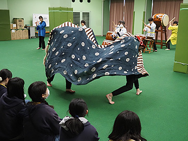 仙台育英獅子太鼓部による和太鼓演奏を見学。代表生徒によるダイナミックな演奏や獅子舞の動きに引き込まれた様子で、和太鼓の体験でも獅子太鼓部の生徒から楽しそうに叩き方を教わっていました。