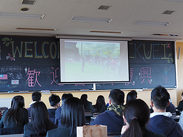 外国語コース2年生の生徒たちが台湾の生徒とそれぞれ1名ずつペアになり、中講義室で歓迎した後に校舎やキャンパスを案内しました。生徒たちは日頃授業で習っている英語と中国語での自己紹介から始まり、学校のことや趣味などを楽しそうに話していました。また、本校で学ぶ海外からの留学生たちの授業風景も見学しました。