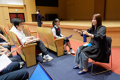 最後は、奈良女子大学に入学した渡邊さんが工学部で学んでいる授業の様子を説明し、プログラミングや電子工学の課題を具体的に紹介してくれました。「私は外国語コースに入学して、さらに高校2年生からIBDPを学びたいと考え秀光コースを選びました。ラクロス部にも所属していたので、IBの課題をこなす時間を捻出することに苦労しましたが、努力を重ねてやり抜きました」と、忙しくも充実した学校生活を振り返りました。