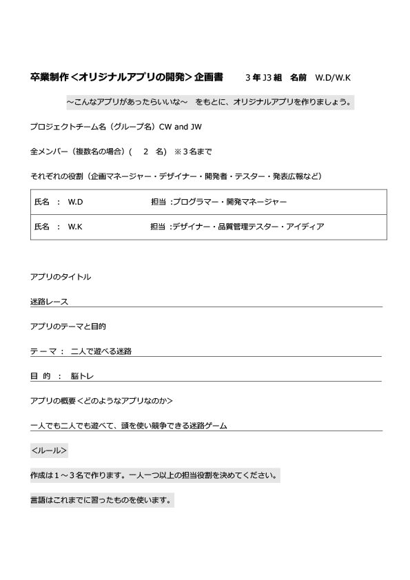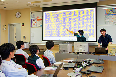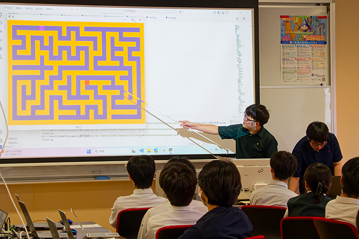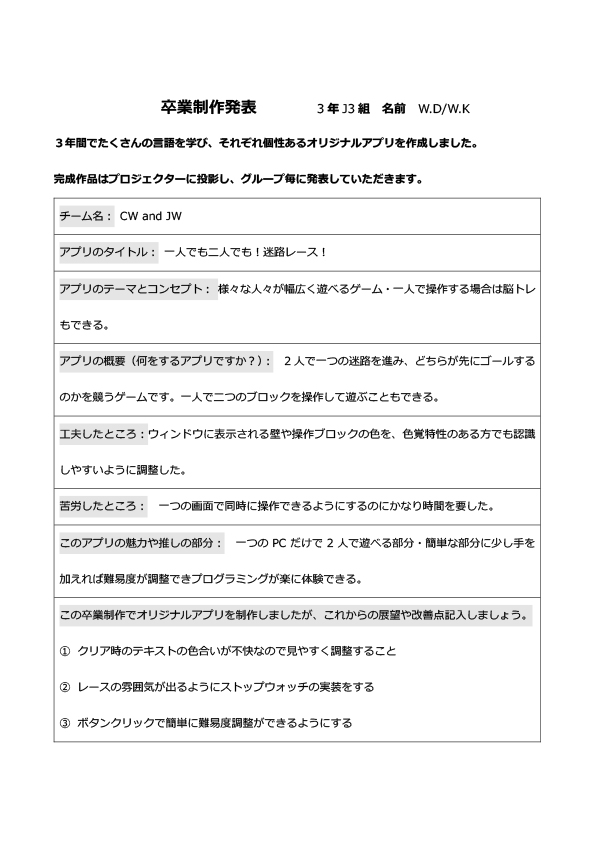 今年の授業では、代表グループが9月時点での途中経過を発表してくれました。2名で制作中のゲームは、迷路をレース形式でクリアするという内容で、プログラムの数値を変更することで迷路の難易度を調整できる仕組みを組み込んでいます。発想力と技術力の両面で大きな成長が見られる作品となっています。発表資料は下記に掲載しておりますので、ぜひご覧ください。
