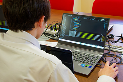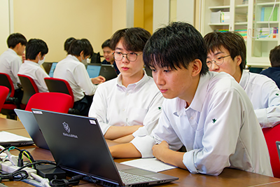 情報科学コースでは、情報処理検定やMOS試験などの資格取得に加えて、学びの総括として、3年生時に学校設定科目「卒業制作」を実施しています。生徒は1人から4人程度まで自由にグループを組み、Python、C言語、Java、Scratchなど、これまでの授業で学んだ言語を用いてオリジナルのアプリやゲームを企画・制作します。使用する言語の指定はなく、生徒が主体的に選び、自由な発想で取り組むことが大きな特徴です。制作は6月から始まり、アプリの企画とプログラミングを進め、11月末から12月にかけて発表を行います。昨年度は先生が驚くほどの完成度を誇る作品も披露されました。