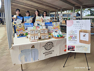 また藤崎様、三本珈琲様のコラボ商品「ほっか珈琲」の販売も行われ、三本珈琲様のブースにおいて生徒がプロジェクト説明を行いました。「ほっか珈琲」お歳暮販売に向けて、商品説明、生徒インタビューなど今後も藤崎様と協力して活動を進めていく予定となっております。