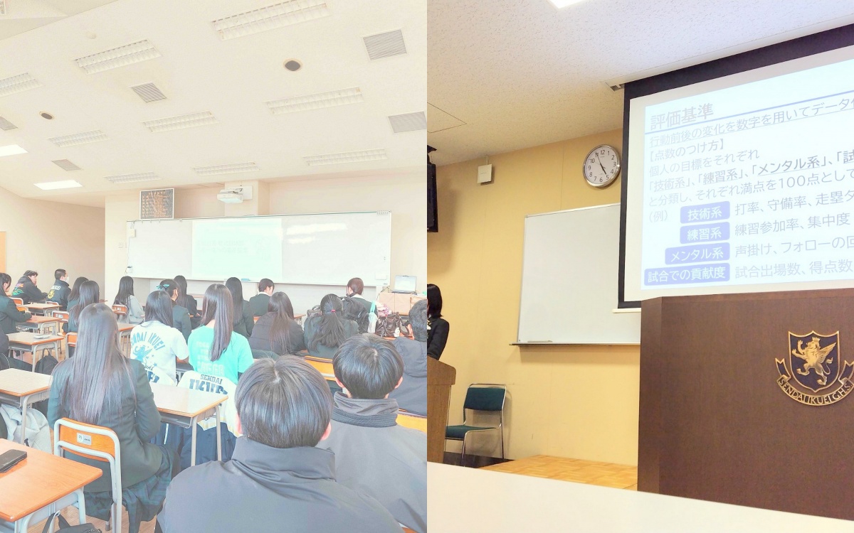 軟式野球部をサポートした令和7年度のクラブコンサルティング部門の全校報告会を行いました。宮城野校舎と多賀城校舎をオンラインでつなぎ、全学級の室長、全部活動の部長が参加しました。