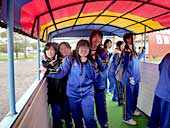 “風学科”の乳しぼり、乳牛への給餌体験は、摩周湖麓にある『渡辺体験牧場』で。酪農についての説明を受けてから、いよいよ乳しぼりの体験。交替で乳をしぼります。しぼりたての美味しい牛乳を飲んで、次の体験へ。