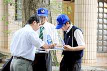 署名活動には、2007年の『I-Lion Day』に多賀城校舎グローリーホールで講演をしてくださった井上保孝さん・郁美さんご夫妻をはじめ、被害者遺族の方々も参加しました。これまで本校生徒会は、井上さんご夫妻が幹事を務める『飲酒・ひき逃げ事犯に厳罰を求める被害者遺族・関係者全国連絡協議会』のメンバーの方々とともに、仙台市内をはじめ、東京都台東区JR上野駅前、埼玉県さいたま市のJR大宮駅前など各地で署名活動を行っています。今回もメンバーの方々は、背中に「絆」の文字が書かれたTシャツを着て、署名を呼び掛けました。