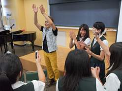 質問者にはサイン入りの写真カードが配られました。そしてサイン入りCDを懸けた、全員参加のじゃんけん大会も実施され、会場には英語のじゃんけんの掛け声“Rock, paper, scissors, set shoot!”と笑い声があふれました。