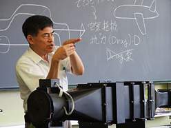 第2回は、「車の空力性能を向上させよう〜万能の天才レオナルド・ダ・ヴィンチものめり込んだ『流体』の世界〜」。『流体』とは、気体、液体など固体以外のもの(アルコールや空気など)。大学院では、流体がどのような力を及ぼすか考え、その知見を役立てていくための学問を研究しているとのことでした。流体工学を利用して、競泳用の水着やゴーグル等で抵抗をいかに減らすか、という開発研究もされているそうです。