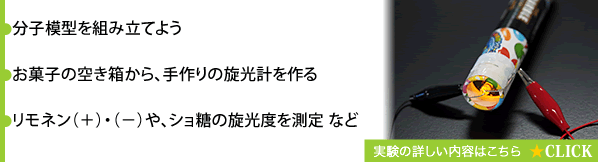 全7回のサイエンス・コ・ラボが、今年度の締めくくりとなる第7回目を迎えました。今回のテーマは『分子のキラリティ(対掌性)と旋光度の実験』。東北大学高度教養教育・学生支援機構の助教である小俣乾二先生とTAの方から、分子の構造が対掌性(キラリティ)であるときの特性や、旋光性を計測するにはどうすればよいかについて指導をしていただきました。