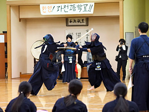 総領事と、在日本大韓民国民団 福島県地方本部で日韓青少年交流活動をすすめている孫哲鎬さんにご協力いただき実現したものです。果川高校からは1・2年生の男女計16名の剣道選手が、11日に福島県白河市で行われた『第5回登龍杯争奪高校 全国選抜剣道大会』に出場後、来仙しました。
