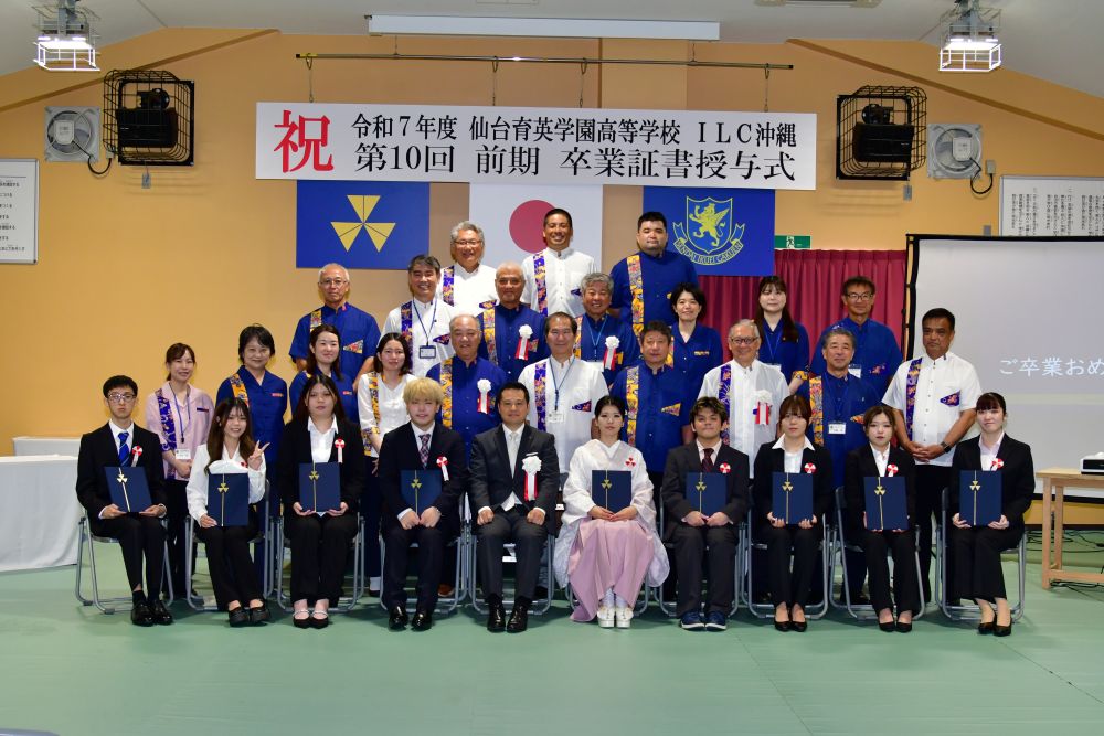 令和7年9月14日(日)仙台育英学園高等学校 広域通信制課程 ILC沖縄 第10回前期卒業証書授与式が挙行されました。この日、卒業を迎えたILC沖縄の卒業生は9名。それぞれが過ごした高校生活は違いますが、一人ひとりが自分のペースで成長した高校生活だったと思います。今回の卒業証書授与式は、加藤雄彦校長先生がご公務で不在のため、加藤聖一沖縄高等学校校長先生から卒業生一人ひとりに卒業証書が授与されました。その後の式辞においても、加藤聖一沖縄高等学校校長先生から、加藤雄彦理事長先生の心温まる式辞の言葉が卒業生に伝えられました。
