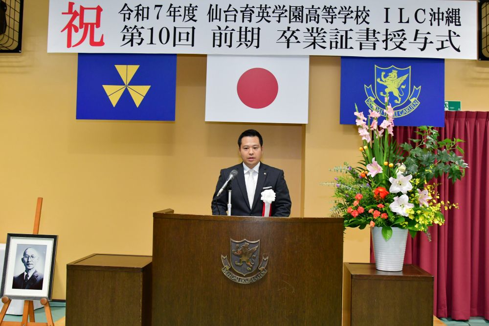 「今日、ここに立つ皆さんは、戦後80年という節目の年に、仙台育英学園を卒業し、8万5千を超える仲間の一員となります。皆さんは、このILC沖縄で学び、仲間と励まし合い、自分の道を切り開いてきました。その歩みこそ、誇りです。どうか忘れないでください。平和と自由は、誰かが与えてくれるものではありません。先人たちが守り抜き、私たちが次の世代へと手渡す宝です。皆さんの未来が命輝く日々でありますように。ご卒業、本当におめでとうございます。」