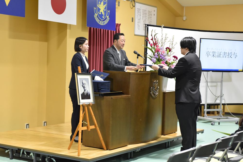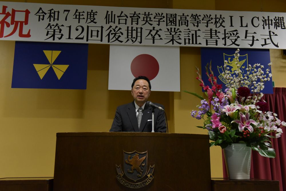 令和8年3月11日(水)仙台育英学園高等学校 広域通信制課程 ILC沖縄 第12回後期卒業証書授与式が挙行されました。この日、卒業を迎えたILC沖縄の卒業生は65名。高校卒業資格となる卒業証書は、加藤雄彦校長先生から卒業生一人ひとりに手渡しされました。その後の式辞の中で、校長先生から次のように温かい激励の言葉が卒業生に送られました。