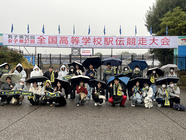 研修2日目の22日は今回の研修旅行のメインイベント、全国高等学校駅伝競走大会(於:たけびしスタジアム京都)へ。都大路を舞台に全力でタスキを繋ぐ本校陸上競技部の男子・女子両チームの選手たちに、生徒たちは「頑張れ!」と夢中で大きな声援を送りました。