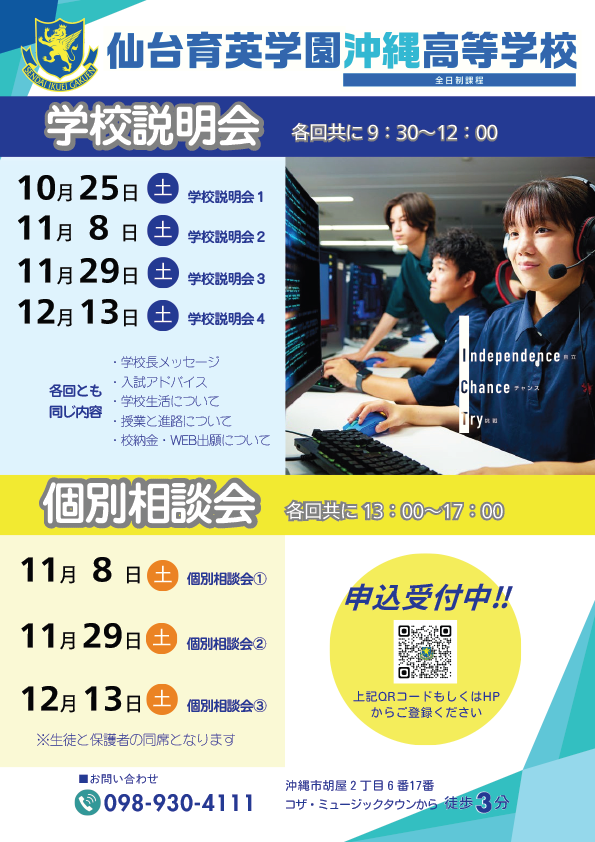 ※先に学校説明会に参加してから、個別相談会に参加してください。予定として、事前に予約登録することは構いません。