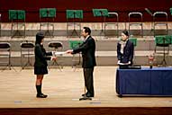 | 6. 自由研究論文の表彰 今年は北村さんの「バランス能力」が最優秀賞に選ばれました。 ※自由研究論文…4年次3月に京都へ研修旅行へ出かけ各自研究テーマを決め、8,000字の自由研究論文を5年次の8月に完成させます。 |