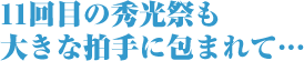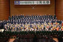 | 毎年恒例の秀光祭も今年で11回目。1日目は合唱コンクール、2日目は保護者や一般のお客さまをお招きしてのステージと、2日間にわたって開催されました。会場がたくさんの観客で埋めつくされた秀光祭2日目は、自由研究論文優秀作品の表彰、学年別吹奏楽演奏、そしてオーケストラ演奏など、“Language & Music”の学習の成果が披露されました。特にトリを飾るオーケストラの「カルメン」は大迫力で会場中は盛り上がり、今年も大成功のうちに幕を閉じました。 秀光祭の様子を写真でご紹介しましょう。 |