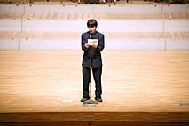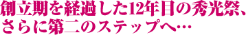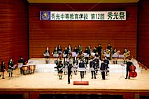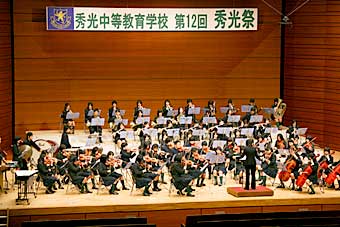 | 秀光祭は今年で12回目。当日は、保護者や一般のお客さま、そしてホームカミングデーとして駆けつけた1期生から6期生までの秀光OB・OGなど、たくさんの観客で会場が埋めつくされました。ステージはノリのいいナンバー『It don't mean a thing』で幕開け。早くも会場は大いに盛り上がりました。続いて生徒会長の瀧澤くんが、生徒を代表して先生方や保護者に感謝の言葉を伝えました。合奏発表では、学年別吹奏楽演奏やオーケストラ演奏など、“Language & Music”の学習の成果を披露。最後に校長先生の言葉、そして全員合唱で締めくくられ、秀光祭は今年も大成功で幕を閉じました。 秀光祭の様子を写真でご紹介しましょう。 |