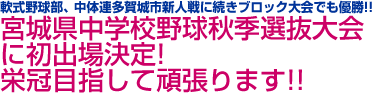 軟式野球部が、先日初優勝に輝いた第6回東北少年新人野球宮城県大会に続いて、中体連多賀城市新人戦、さらに中体連・ブロック大会でも優勝の栄冠を手にしました。