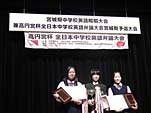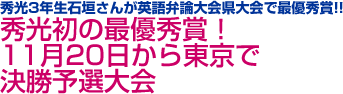 9月26日に開かれた「高円宮杯第60回全日本中学校英語弁論大会」の県予選大会に、3年生の石垣さんと根本さんが出場しました。大会には、県内各地から地区予選を勝ち抜いた19人の中学生が参加。その中で石垣さんが見事、最優秀賞に選ばれました。石垣さんは、11月20日から東京のよみうりホールなどで開かれる決勝予選大会に出場します。最優秀賞を受賞して全国大会に出場するのは、秀光中等教育学校初の快挙です。