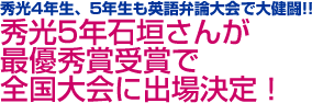 英語弁論大会で、また秀光生が最優秀賞に輝きました! 10月24日、パレットおおさきを会場に行われた「第56回東北六県中学校英語暗唱・高等学校英語弁論大会」に、秀光を代表して5年生の石垣さん(宮教大附属小出身)と4年生の水津さん(小松島小出身)が出場しました。最優秀賞は見事、石垣さんの手に! 来年2月には「第2回全国高等学校英語スピーチコンテスト」への出場も決定しています。石垣さんの全国大会での活躍にも期待しましょう。
