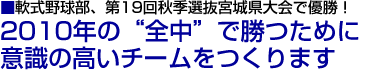 | 本校軟式野球部は、地区予選を勝ち抜き、多賀城市・塩竃市・宮城郡・黒川郡代表として、第19回秋季選抜宮城県大会に出場しました。試合は平成21年10月31日・11月1日、シェルコム仙台(仙台市泉区)で開催。初出場の昨年は初戦敗退という結果でしたが、今年は生徒たちの努力が実り、優勝を勝ち取りました。 試合中はキビキビ動き、 挨拶や生活態度もきちんと 創部5年目、ここ数年でめきめきと実力をつけてきた秀光軟式野球部。野球の技術を磨くことに加えて、部員全員が日頃からしっかりとした挨拶や生活態度を心がけています。今回の試合中も選手たちはキビキビと動き、大会会長から「秀光の野球のプレーのマナーは素晴らしい。中学野球のお手本です」とのお誉めの言葉をいただきました。 第19回秋季選抜宮城県大会の結果はこちら |
