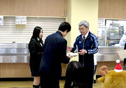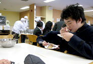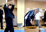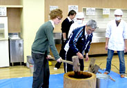 第3日・木曜日は北辰館食堂での餅つき。瀬川教頭先生からの見本演技(?)に始まって、留学生も参加。たいへんに盛り上がった末においしいお餅がつきあがり、みんなでいただきました。
