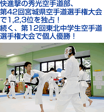5月3日、部が誕生して初めて出場した大会、『第42回宮城県空手道選手権大会』(大和町総合体育館)において、なんと“1、2、3位独占”という快挙! 続いて5月17日に宮城県武道館で開催された『第12回東北中学生空手道選手権大会』でも個人優勝を果たしました。