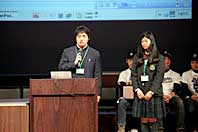 そして大会当日、参加チームの中で唯一の学生服姿である秀光2チームは、全力で6分間のプレゼンテーションを乗り切りました。写真がそのときの様子です。