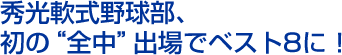 第32回全国中学校軟式野球大会が8月19日(木)〜22日(日)まで岡山県倉敷市で開催されました。東北予選会で優勝した秀光軟式野球部は“東北第1代表”として出場。夢の全国舞台で戦いました。 初の全国大会出場でベスト8 暑さに負けず“熱く”戦いました 倉敷運動公園野球場で行われた大会2回戦で、秀光軟式野球部は上富田中学校(和歌山)と対戦し2対0で勝利。全国大会初勝利をあげました。気温35度近い猛暑の中でも集中力を欠くことなく、持ち味の“考える野球”でベスト8入り! 大会3回戦、準々決勝は上三川中学校(栃木)と戦い、0対1と惜敗。秀光ナインは5安打を放ち、ヒット数では対戦校より上回りましたが本塁まではあと一歩でした。