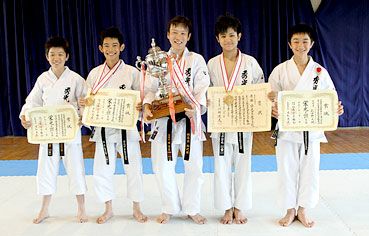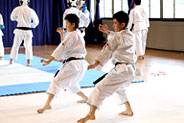 全国86団体の頂点へ! 「大切なのは声を出すこと。きつい時にこそ声を出し、声をかけ、仲間と励まし合っていくことを重点的に指導しています。空手道をとおして人格形成もはかっています」と話す監督の佐藤飛鳥先生のもと、部員たちは厳しい稽古を重ね、全国の舞台でその成果を発揮し“団体組手”で優勝!! 全国86団体の頂点へ輝きました。 “個人形”は第5位 世界大会まであと一歩! “個人形”では2年生の飛田野くんが大会第5位となりました。世界大会への出場権を獲得できる第4位まで あと一歩のところ。今後の稽古の課題ができたようです。 |