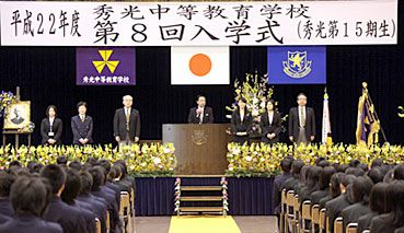 秀光中等教育学校第8回入学式(秀光中学校から数えて第15期生)が4月3日、多賀城グローリーホールで挙行されました。真新しい制服に身を包んだ新入生は少し緊張した面もちで、会場に並びました。